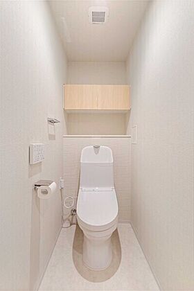 ※販売対象に家具・調度品は含まれません。年中快適に使用可能な温水洗浄便座付きのトイレです。背面には吊戸棚が備わっています。