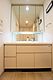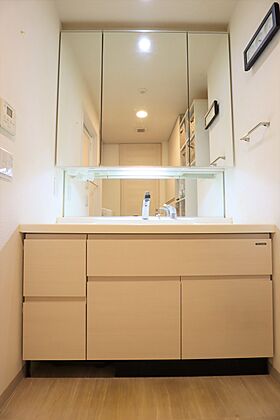 収納スペースが多い三面鏡洗面化粧台。洗面室からキッチンへの行き来が出来、水廻りの移動がスムーズです。