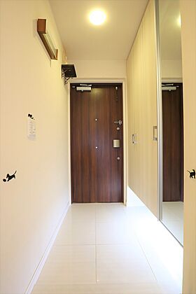 玄関扉はダブルロック、サムターン回し防止機能を採用。鏡があり、外出前に身だしなみのチェックができます