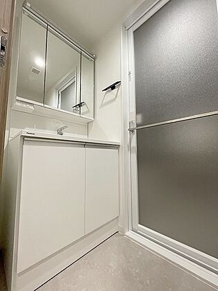 三面鏡に洗面台。 コンセントに照明機能、多機能性を備えた設備です。