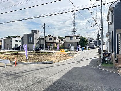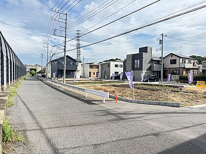 【前面道路含む現地写真】前面道路は敷地との高低差がほとんどないため、駐車スペースを設けた際も車の入出庫をスムーズに行えます。