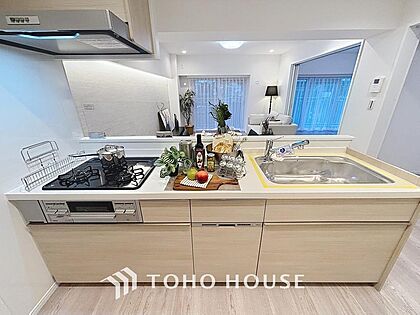 「キッチン」お部屋の雰囲気に溶け込む、インテリアの一部のようなオープンキッチンです。リビングにいるご家族とのおしゃべりを楽しみながらの作業が可能です。