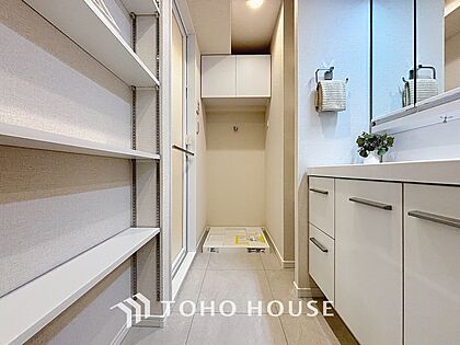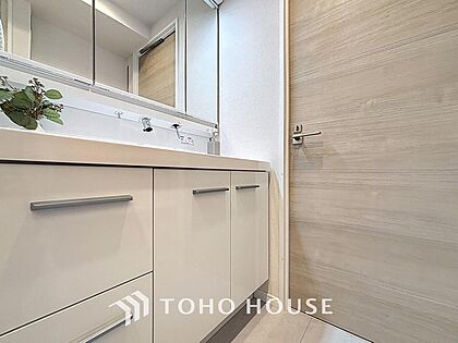 「洗面所」明るく清潔感のある色調で纏められた洗面室は、機能性に富んだ三面鏡と使い勝手の良い収納を完備した洗面台を設置しております。