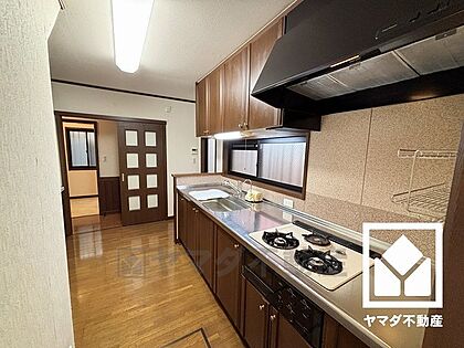 キッチンは空間を有効活用できる壁付けタイプ。毎日の料理がもっとスムーズになる、便利な3口コンロ仕様。は窓がございますので、昼間は手元が明るく、お料理がはかどります。