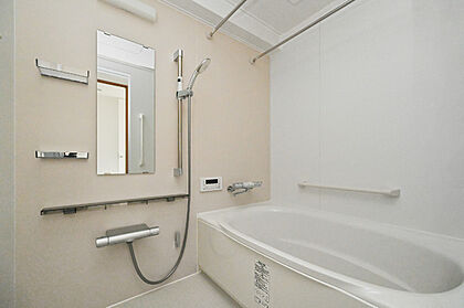 雨の日や花粉症対策に重宝する、浴室乾燥機付きの浴室です。一日の疲れを癒してくれる空間です。【浴室】