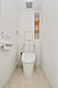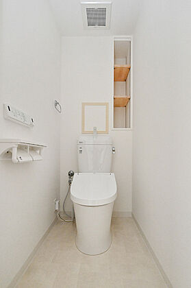温水洗浄便座付きです。背面に棚があり、トイレットペーパーなどのストックにご活用いただけます。【トイレ】