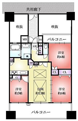 各部屋がバランスよく配置された間取りです。LDKは約13帖広めに確保されています。二つの洋室がそれぞれ約6帖あり収納付きです。バルコニーが2か所あり開放感も感じられます。動線も工夫された設計です。