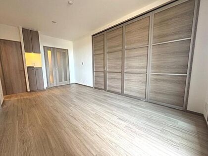 ナチュラルな木目調の床が落ち着いた印象を与えます。大きな収納スペースが備え付けられています。室内はすっきりとしており家具の配置も自由度が高いです。広さが感じられるリビング空間です。