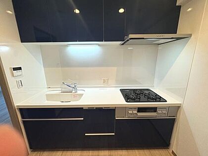 清潔感のあるホワイトの天板が特徴です。収納が充実しておりすっきりとした印象です。ガスコンロとシンクが使いやすい配置になっています。キッチン全体が明るい雰囲気を持っています。
