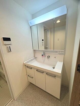 明るい空間に調和する洗面台は収納スペースも豊富で日常使いに便利です。三面鏡が付いており使いやすさが感じられます。清潔感のあるデザインが印象的で細部まで手入れが行き届いた一角です。