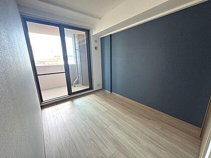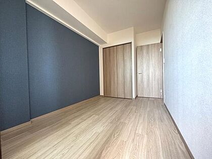 シンプルなデザインの洋室で壁面のアクセントカラーが印象的です。木目調の床と建具が調和し清潔感があります。収納スペースもありすっきりとした雰囲気です。日差しが入りやすく明るさも感じられます。