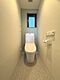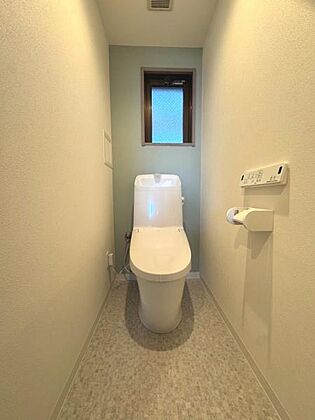 清潔感のあるシンプルな空間で快適にご利用いただけるトイレです。小窓が設けられており通気性にも配慮されています。壁付けの操作パネルが設置されており使いやすさが感じられます。無駄のない設計が魅力です。