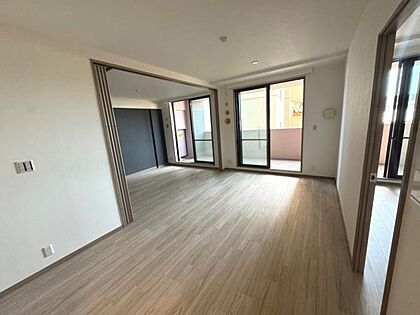 大きな窓から光が差し込む開放感のあるリビングです。明るい床材が空間を広々と見せてくれます。シンプルな内装で好みのインテリアにアレンジしやすい点も魅力です。スライドドアで空間の使い分けができます。
