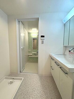 明るい照明が特長の洗面台と清潔感のある内装が魅力の洗面所です。広めのスペースで使い勝手の良いレイアウトとなっています。洗面台の収納も充実しており日常の使いやすさが考えられています。