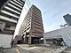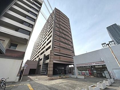 落ち着いた色合いの外観が周囲に調和しています。エントランス周辺はゆとりのあるスペースとなっています。建物全体がすっきりとしたデザインで印象的な佇まいです。隣接施設とのアクセスも便利そうです。