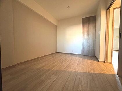 落ち着いた色合いのフローリングが空間を引き立てます。収納スペースも備わっているためお部屋をすっきり使いやすくなっています。扉や壁のシンプルなデザインが洋室全体に統一感を与えています。