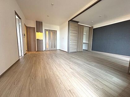 リビングは開放的な空間で床材や建具が落ち着いた雰囲気を演出しています。大きな壁面がアクセントになっておりすっきりとした印象です。仕切りもあり柔軟に使い分けが可能です。