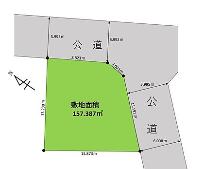 | 土地面積/坪(坪単価) | 157.38m2(登記簿)/47.69坪(94.40万円) | 代表的な接道 | 角地 公道 北東 6m、南東 6m ※詳細は備考欄をご確認ください |