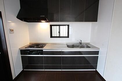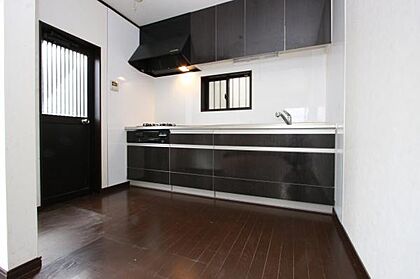 システムキッチンは窓と勝手口があり明るいです色調はフローリング・建具と統一感のあるダークブラウン