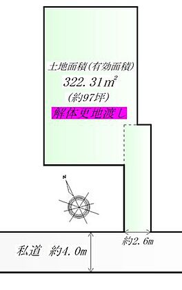 | 土地面積/坪(坪単価) | 322.31m2/97.67坪(10.10万円) | 代表的な接道 | 一方 私道 南東 4m ※詳細は備考欄をご確認ください |