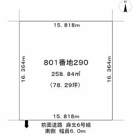 | 土地面積/坪(坪単価) | 258.84m2(登記簿)/78.44坪(71.40万円) | 代表的な接道 | 一方 公道 南 6m ※詳細は備考欄をご確認ください |