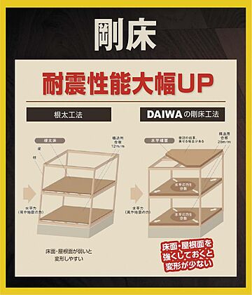 「剛床工法」を採用し、地震時に建物にかかる水平方向のパワーを、効率よく柱や耐力壁に分散することで、建物全体でしっかりと揺れをおさえ、耐震性能を大幅にアップ。