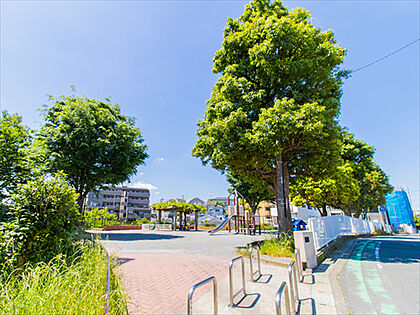 シンボルツリーが優しい影を落とす公園は、爽やかな風が通り抜けます。スタイリッシュな遊具が特徴的。空に近く眺めのいい公園です。