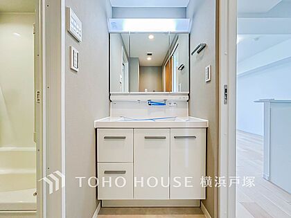 【Powder room】清潔感のあるプライベート空間は、身だしなみチェックや肌のお手入れに最適です。収納もあり、スッキリと見映えの良い空間に拵えました。時間に余裕とゆとりを持たせます。