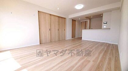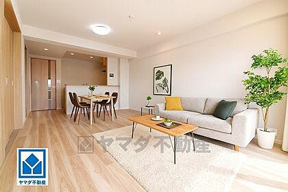 大きな窓のあるリビングは、陽光あふれる明るい空間です。居心地良く、ご家族皆がゆったり寛げる憩いの空間となりそうです。