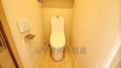壁リモコンタイプのウォシュレット付き。すっきりした見た目で、トイレ奥の掃除もしやすいです。