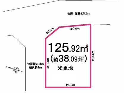 | 土地面積/坪(坪単価) | 125.92m2(登記簿)/38.16坪(23.10万円) | 代表的な接道 | 角地 公道 北東 5.2m、北西 4m ※詳細は備考欄をご確認ください |