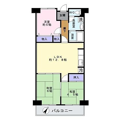 洋室と和室がバランスよく配置されている間取りです。LDKは約12.8帖と広さがありゆったりとした空間を確保しています。バルコニーに面した和室が2部屋並んでおり使い分けができます。