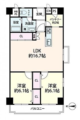 <間取り図> 南西角部屋につき採光・通風・陽当りどれも良好なお部屋となっております。
