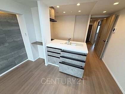 シンクも大きく洗い物もしやすい浄水器付。シャワーヘッドは引き出し可能、シンクの隅々まで洗い流せます。