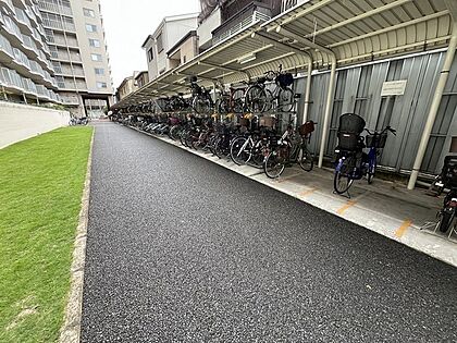 自転車を雨から守る屋根付きの駐輪場がございます。整然と保たれており、管理状態の良さが伺えます。【駐輪場】
