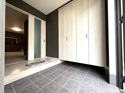 【玄関】シューズボックス付きのシックなデザインの玄関。座って靴の脱ぎ履きしやすい段差があり、玄関ホールも広さがあります。