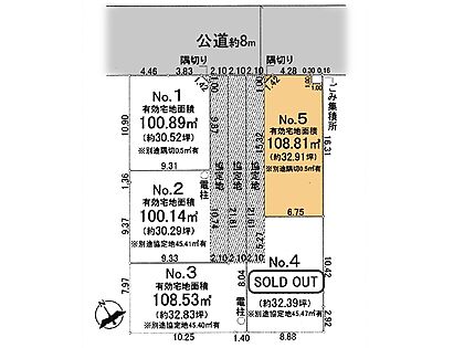 別途隣地との協定地部分あり(2号棟:45.41平米、3号棟:45.40平米) 別途隅切り部分あり(1・5号棟:0.5平米) 敷地内に電柱及び支線が入る場合有