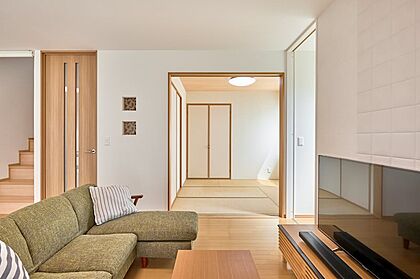 リビング壁奥がウォークスルーの収納になっていて大変便利!