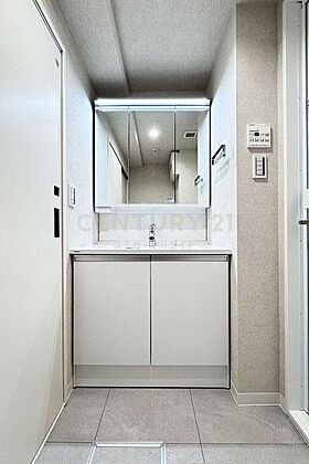 洗面化粧台/新規交換済、三面鏡収納に加え下部収納もあるので嵩張る小物類もすっきり収納が出来ます。