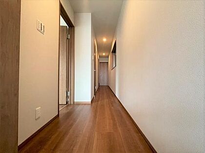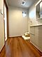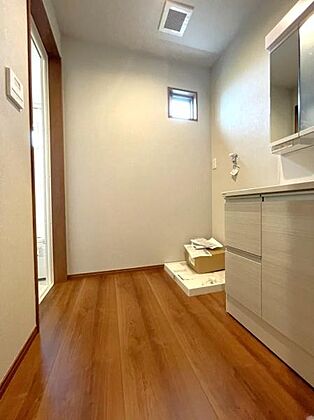 温もりを感じる木目フローリングの洗面所。洗濯パン付きで日々の暮らしを快適にサポートします。