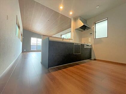 開放的な勾配天井のリビングを望む対面式キッチン。家事をしながら家族との時間を楽しめます。