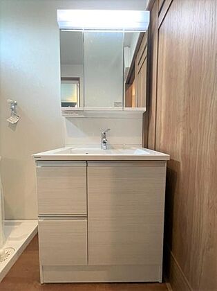 白色木目パネルが爽やかな三面鏡洗面台。収納力もあり、清潔感と機能性を兼ね備えた空間です。