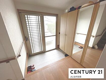 東側玄関の内観です。木目が温かく、明るい空間が広がります♪姿見鏡付シューズボックス付で収納スペースもたっぷり!散らかりがちな玄関もスッキリ片付きます♪