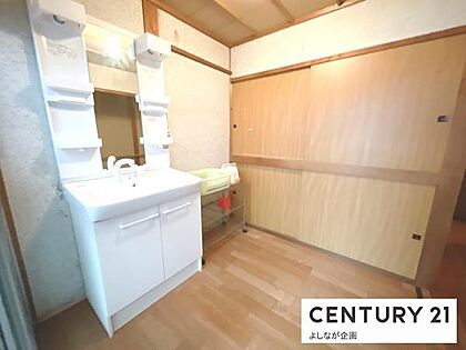 清潔感溢れるスタイリッシュなデザインの洗面化粧台。流し台下に収納付きです。右側には収納スペース付きなので、水回り用品のストックなどに便利です♪