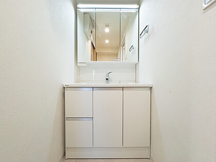 洗面化粧台完備。新規交換され、清潔にご利用いただけます。
