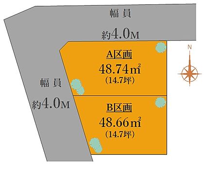 | 土地面積/坪(坪単価) | 48.74m2(登記簿)/14.77坪(540.30万円) | 代表的な接道 | 角地 西 4m、北 4m ※詳細は備考欄をご確認ください |