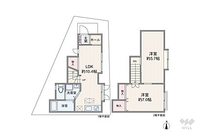 1階LDK10.4帖、2階洋室2部屋7.0帖、5.7帖のプランです。