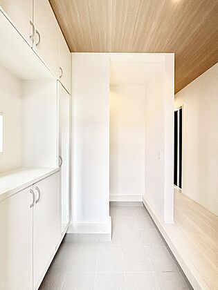 明るい陽光が入り込む玄関。ご家族の靴もスッキリ収納できる玄関収納付き!
