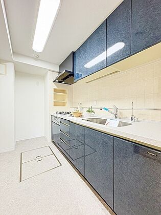 壁付のキッチンは上部に収納が作りやすいのがメリット。空間を有効活用したすっきりとしたデザイン。