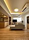 ダウンライトと間接照明が柔らかく照らすリビング。明るさと落ち着きを兼ね備えた居心地の良い空間。